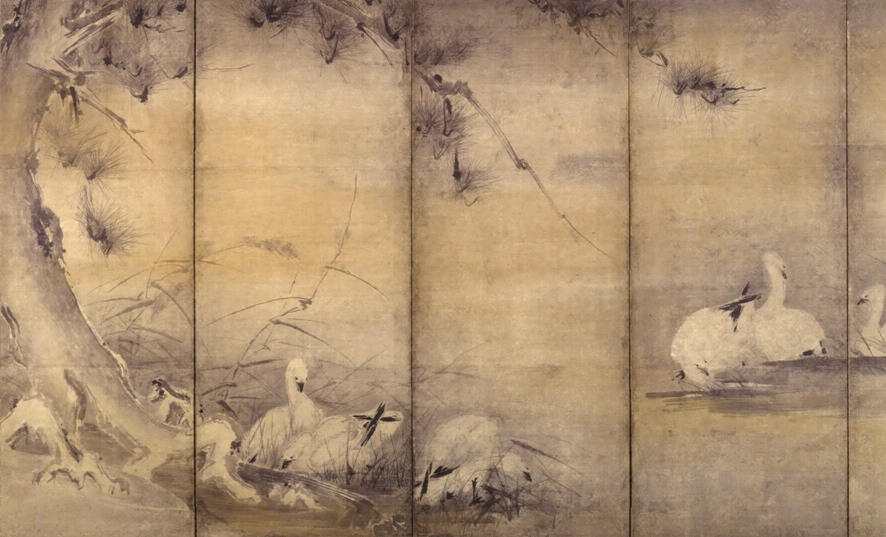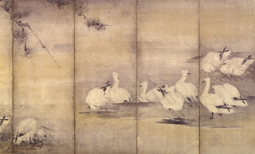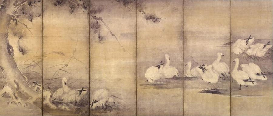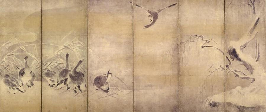 紙本墨画芦雁図〈(伝宮本武蔵筆)/六曲屏風〉
