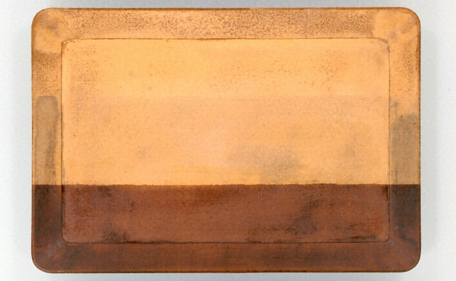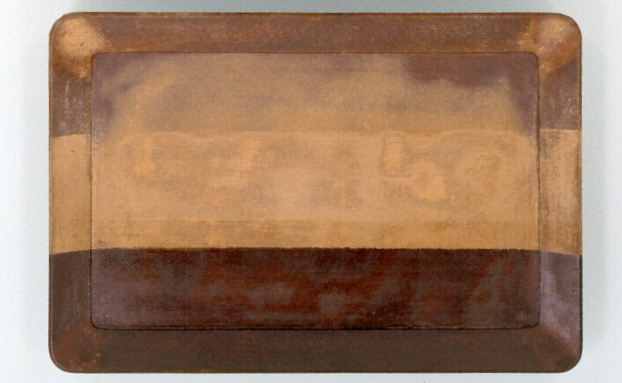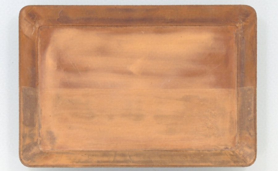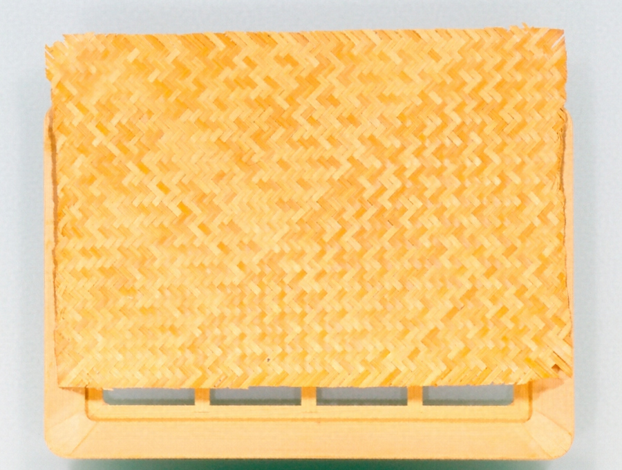 この技術記録は、「蒟醬龍文盆」の制作工程見本である。檜材の木枠に網代を組み込んだ籃胎素地の製作に始まり、布着せ、下地、漆塗、蒟醬彫り、色入れ、炭研ぎ、磨きを経て完成に至る15工程を示している。