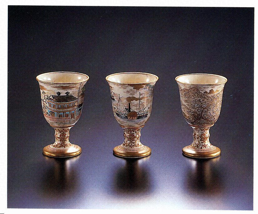 明治10年、住友家から京都・粟田焼の帯山与兵衛に注文制作された記念杯。別子銅山(右)、住友の蒸気船(中)、住友神戸支店(左)が描かれている。同年は広瀬宰平が住友家総理代人(後の総理事)になった年であり、別子銅山の近代化を通じて産業・貿易立国として発展したいという思いが伝わってくる。