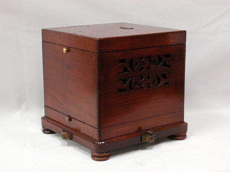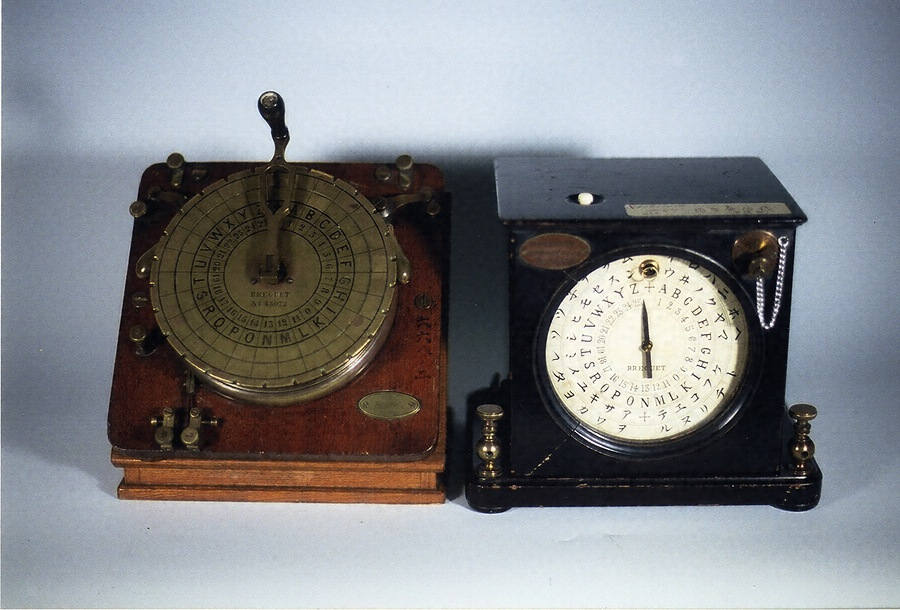 ブレゲ指字電信機は、フランスのブレゲ社が19世紀に製作した電信機で、送信機のレバーを回転させて目的の文字を示すと、受信機の針が回転し、文字を指す仕組みになっています。