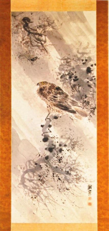 わが国南画の大成者である蕪村の作品には俳趣的志向を示すものと漢画的志向を示すものがある。本図は後者の例であり、激しい自然に対する鳶鴉【とびからす】の姿を墨画の手法で描いたものである。「新緑杜鵑【とけん】図」とともに″謝寅″落款を有し、晩年の作であることが知られる。