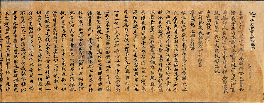 内題にのちの書き入れで「説一切有部順正理論巻第六」と記すが、つぶさには有部の教学の正統説を主張する衆賢造、玄奘訳『阿毘達磨順正理論』(八十巻)をいう。本経は大同元年(806)5月中旬、桓武天皇の皇后藤原乙牟漏のために敬写された経で、穀紙、すなわち楮紙十六枚を継ぎ、巻首の紙背継ぎ目2か所に「中臣之寺」の朱方印を捺し、他に「法隆寺/一切經」の墨方印を捺す。表紙見返しに「法隆寺舎利堂會式料六十五巻之内」と記してあり、はじめ中臣之寺に納められたものをあらためて舎利会式料としたことがわかる。