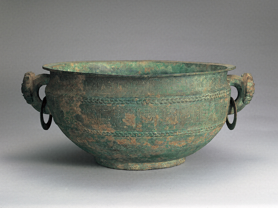 口縁が鍔状に平らになった大きな鉢で、頸の部分がくびれてわずかに肩が付き、丸みのある高台が付く。首から肩に獣面を象った二つの大きな鐶耳が付き、これに薄い遊環をはめている。器の外側には絡縄状の凸帯を二本まわし、これで胴部を三段にわけ、それぞれに浅い彫りの有舌蟠螭文を絡むように施してある。これと同じ作行きで双器であったと思われる鑑が、シカゴ美術館に蔵されている。鑑はもともと水入用であるが、別に浴用に使われたり、氷を容れて冷蔵の容器として使われたともみられている。