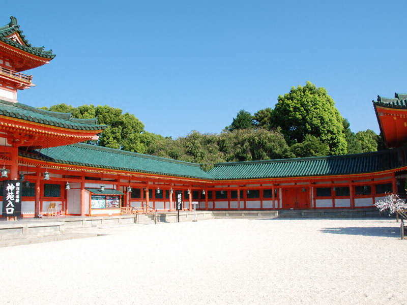 平安神宮の建築は、明治28年、平安遷都千百年紀念祭・第6回内国勧業博覧会の会場施設として平安宮大極殿院を模して計画された。並行して背後に桓武天皇を祀る本殿が建てられ、竣工とともに神社施設とされた。