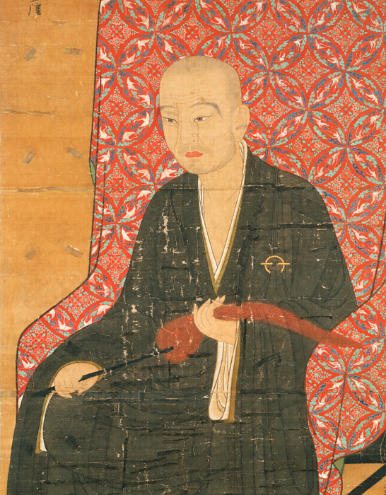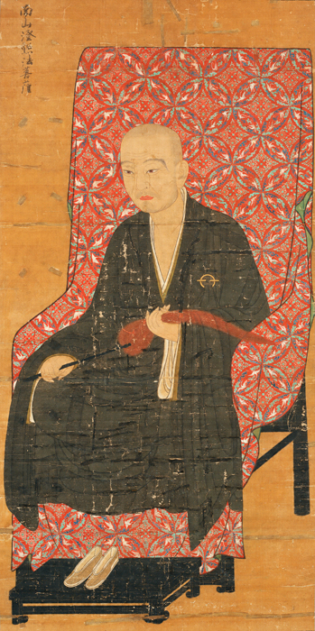 中国・初唐期の僧、南山大師道宣(596~667)の肖像。道宣は『四分律行事鈔』を撰述するなどして律学を大成し、南山律の祖となった。玄奘の訳経にも参加したほか、仏教経典の目録である『大唐内典録』や、仏教史書『続高僧伝』『釈迦方志』、護法のために記された文書を収集した『広弘明集』など多数の書物の撰述をも果たし、偉大な事績を残している。日本には奈良時代に鑑真がその教え(四分律)を伝えたが、鎌倉時代に至って京都や奈良で律学の復興が図られ、その機運にあわせて祖師の肖像画も多く描かれた。