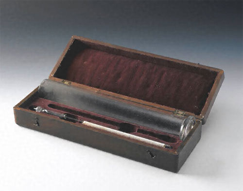 この箱には、元々は試験管と2つのホクトメートルが納められていたものと思われるが、残念ながら1つは購入当時から失われていたとみられ、残る一つも破損している。