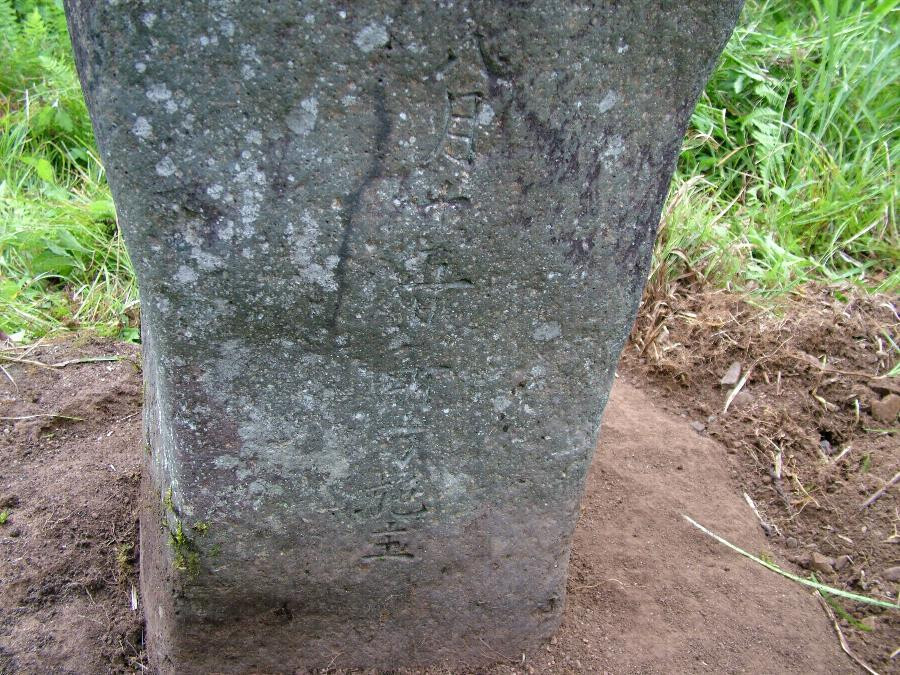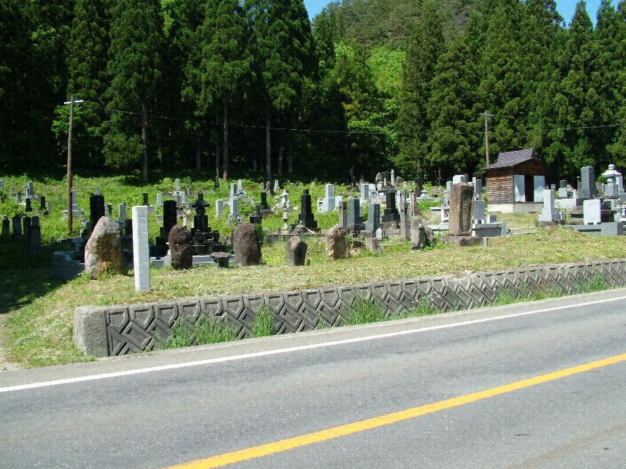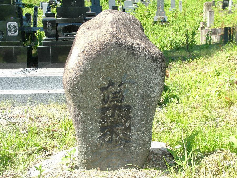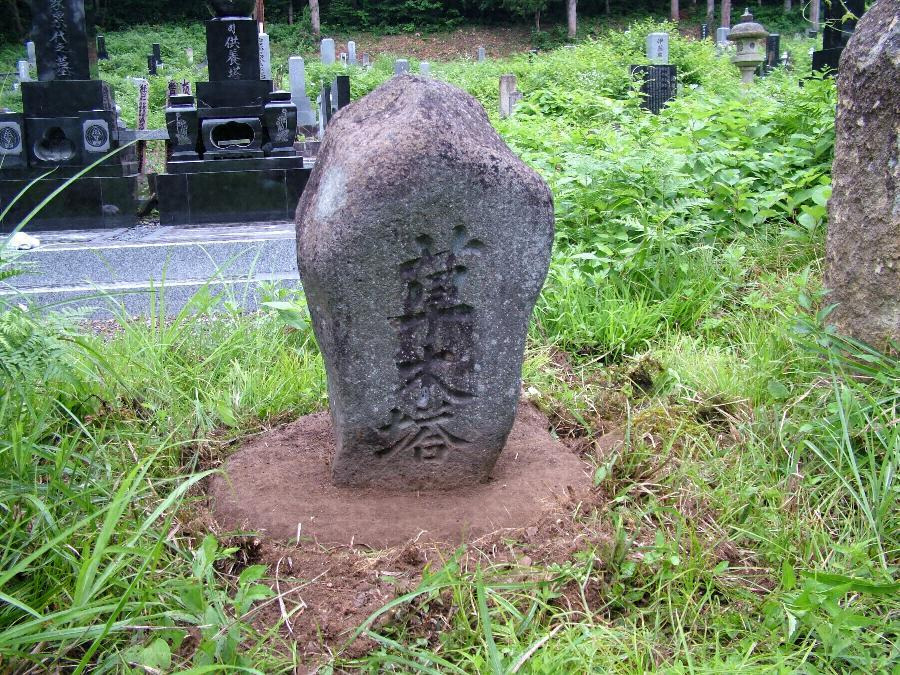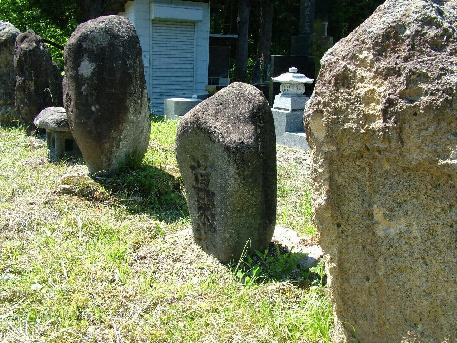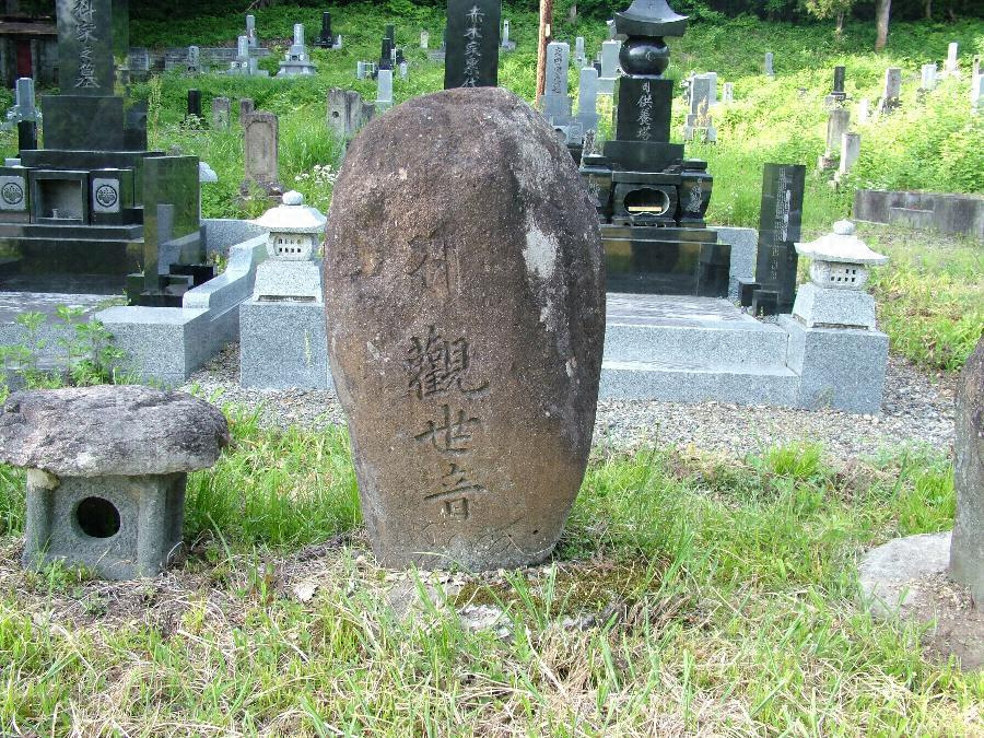 本塔は、移設されたと伝わる石塔群の一つで東泉寺山墓地に存在する。自然石を用いた石塔は、東側の草木塔から順に観世音・三十三度・湯殿山と並列されている。注目されるのは、凝灰岩を加工した台座の形状で、草木塔「円」、観世音「菱」、三十三度「三角」、湯殿山「方」となっており、意図的な可能性もある。