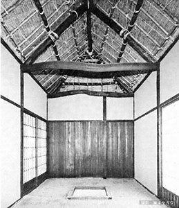 梁間2.7m、寄棟造、西面庇付、茅葺