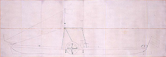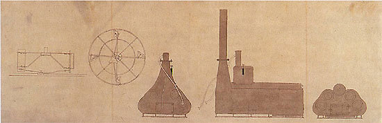 蒸気船の図は、安政元年に幕府が輸入した蒸気艇の側面図で、船の両脇に水車がある外輪船と呼ばれるタイプのものである。蒸気機関の図には、この蒸気船に搭載されたボイラーと外輪が記されている。