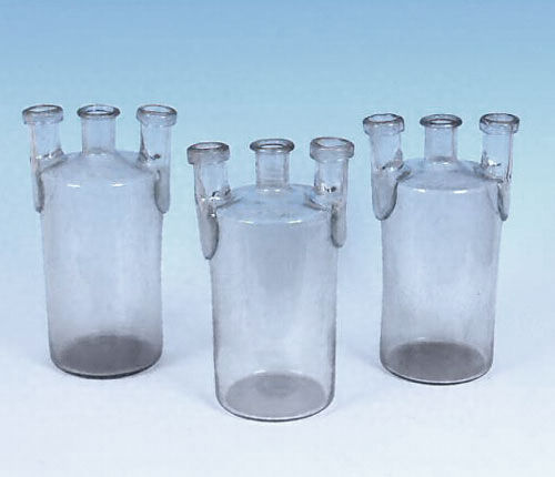 上部に3つの口が開いており、薬品の製造など実験用に使用されていたと思われる。同型の瓶が4点残る。切藁の入った木箱に収納され、「製薬びん四」と書かれている。