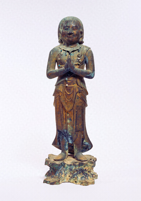 修験道(しゅげんどう)の一大聖地であった白山の、美濃国側の登攀(とはん)拠点に位置する岐阜県郡上市の長瀧寺(ちょうりゅうじ)(明治期に長瀧寺と長瀧白山神社に分離)にあったとみられる像。天台密教では阿弥陀仏の化身とされた金剛童子は白山修験で非常に重視され、不動明王の脇侍・制吒迦童子(せいたかどうじ)に近い姿に表現される。しかし本像の姿は頭髪を総髪(そうはつ)とすること、比較的穏やかな面貌表現、合掌する姿、着衣形式など、不動のもう一方の脇侍・矜羯羅(こんがら)童子に一致する。尊名比定になお謎をのこすが、山岳信仰における童子形像の系譜を考える上で、重要な遺品。