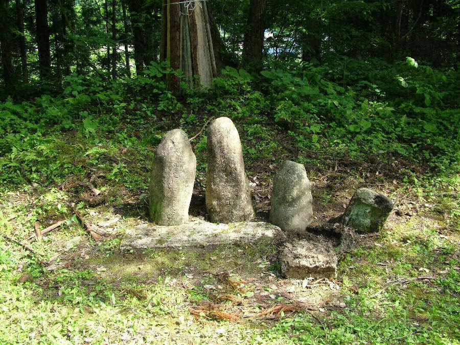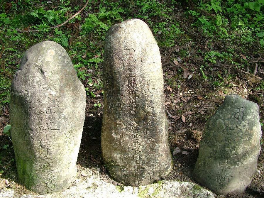 既指定文化財の「塩地平の草木塔」とともに国内最古の草木塔の一つである。中央の本塔に向かって、左に寛政2年の湯殿山、右に文政2年の高平山大明神の石塔の3基が旧道沿いに隣在している。何れも安山岩の自然石を用い、塔頂の種子等から山岳信仰を強く意識していることが窺われる。この3基の石塔は、隣接する湯の花橋から当地に移設したとされる。