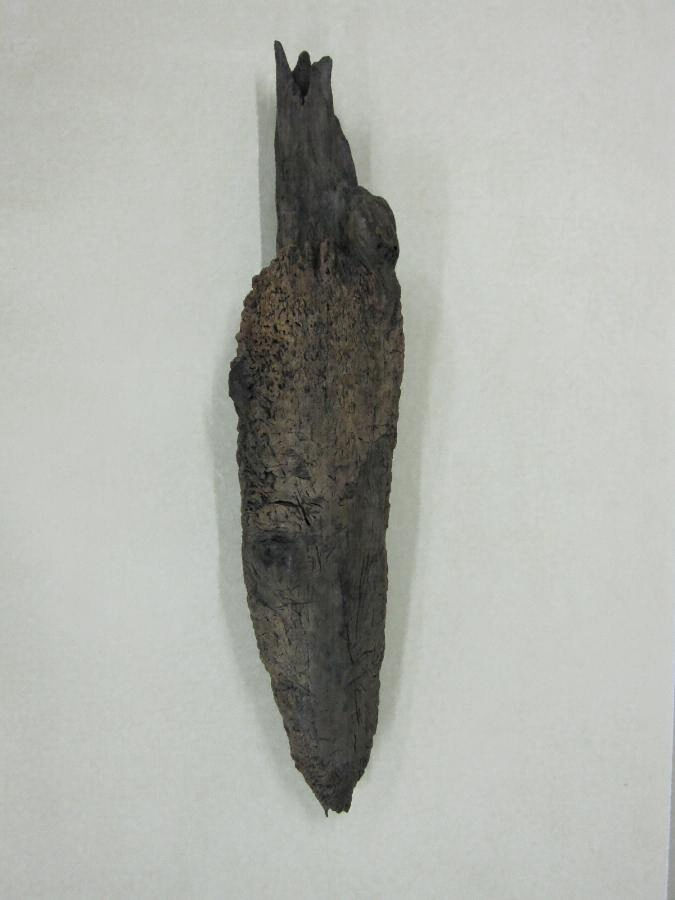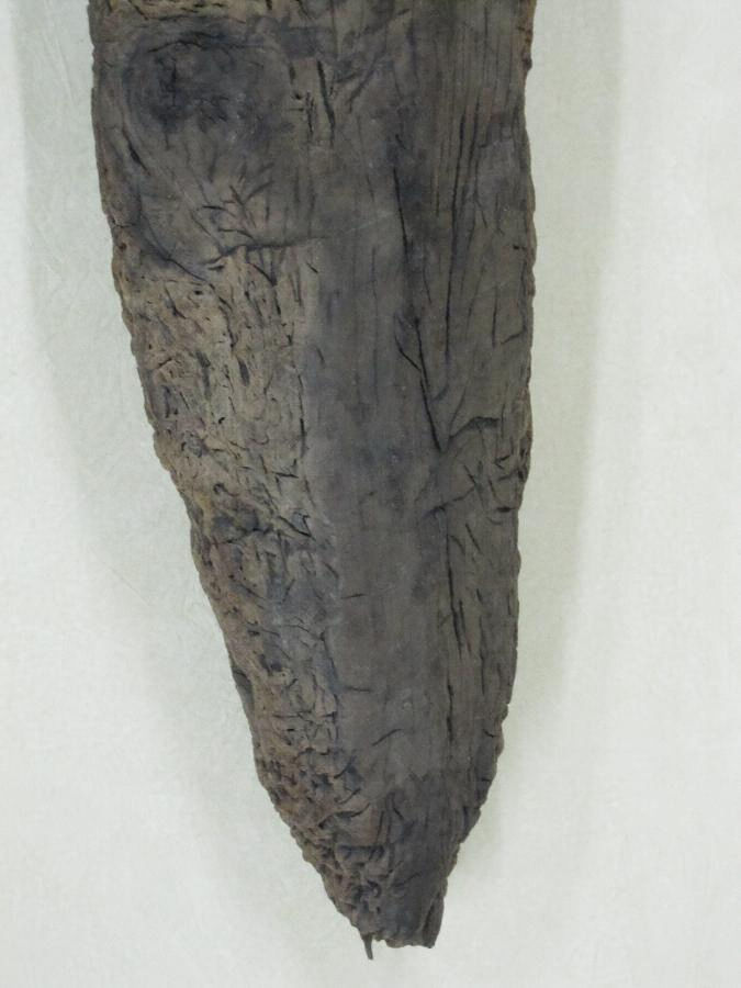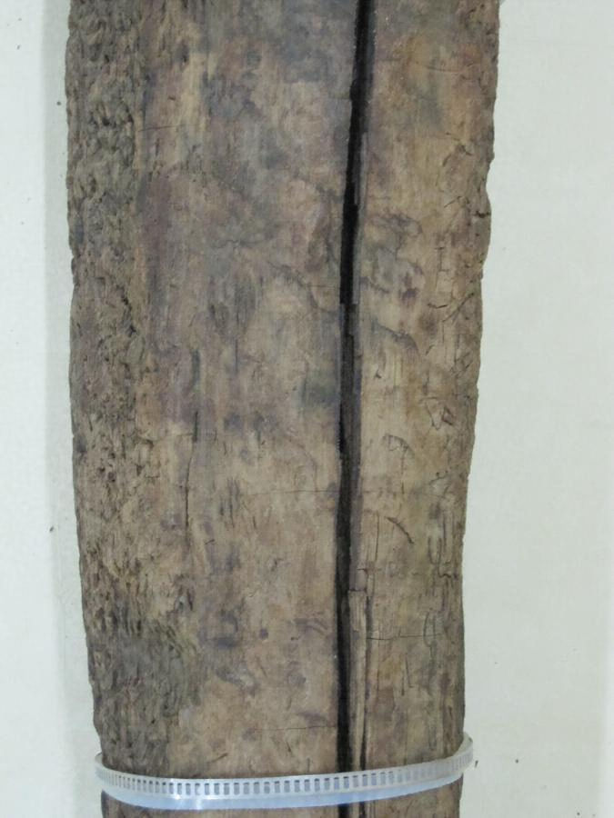 第2号柱根:長さ144 cm、最大径 24 cm 、内部まで亀裂が進行しており、