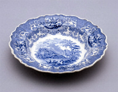 1840年頃、銅版画による転写紙を硬質磁器の器面に貼り付け、施釉して焼成したイギリス製のプリント皿。西洋の想像的な風景で、イタリア風の橋やアルプスを想わせる山岳など、西洋への憧憬を誘う図柄となっている。日本など、東洋への輸入も意識して作られたものであろうか。この種の皿は、比較的大量に輸入されたようで、日本国内に広く散見することができる。