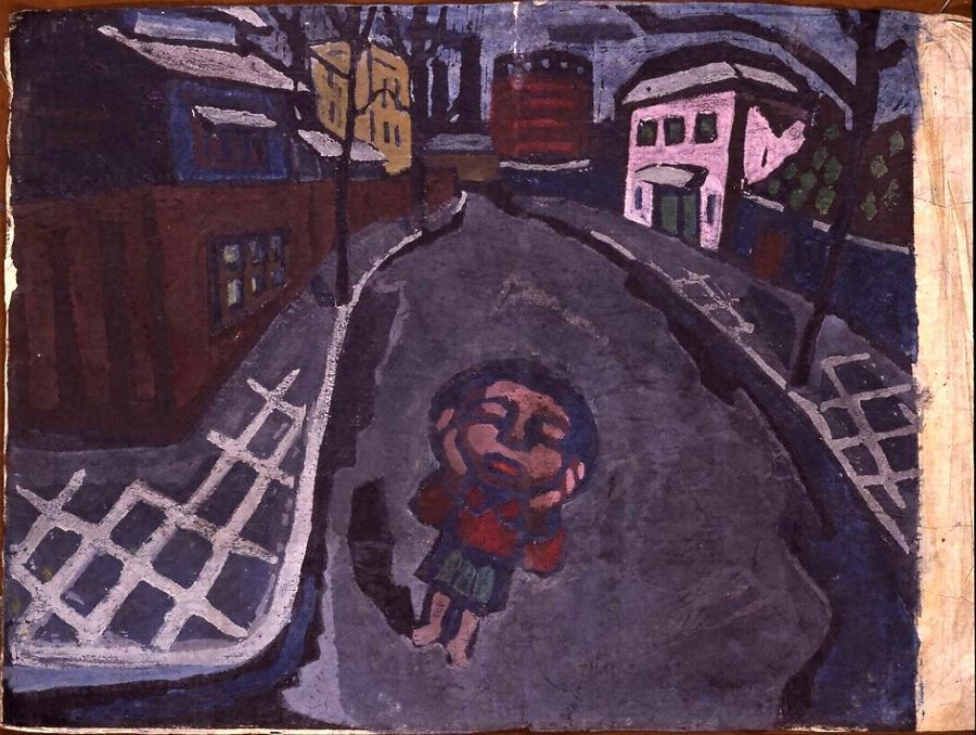 寂しい街角に両手をほほに当てたたずむ素足の少女。魚眼レンズのように風景が歪んでいます。抑えた色調が、煤けた東京の江東の工場地帯をますます重苦しいものにみせています。