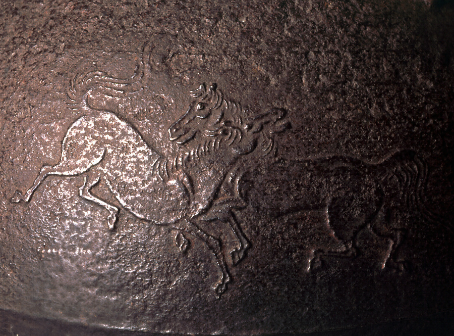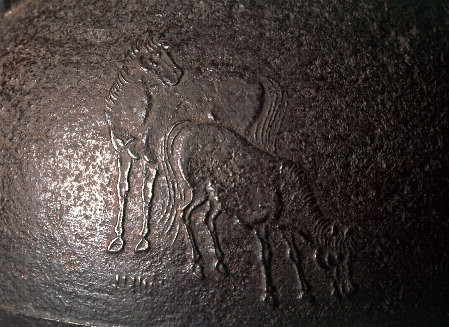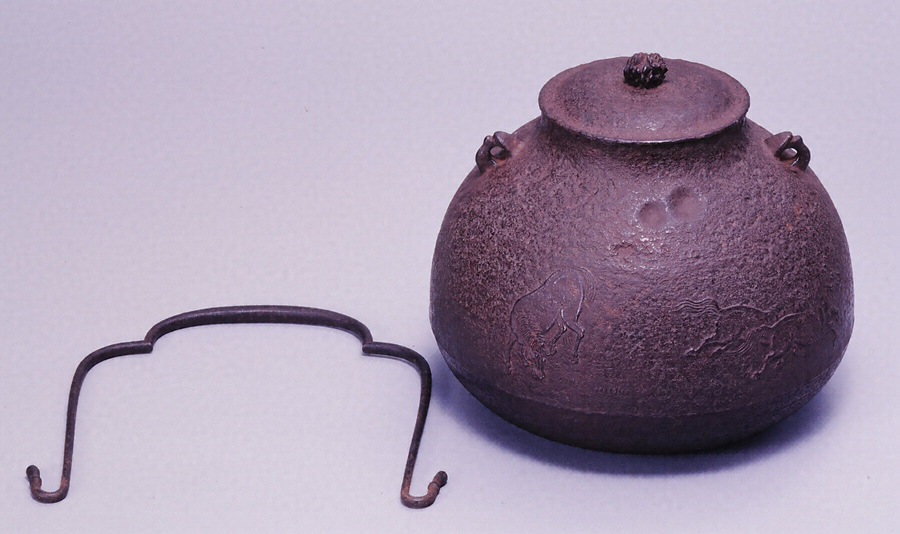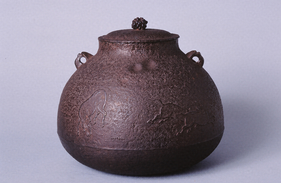 群遊ぶ7頭の馬を全面にあらわす。蓋鈕は松毬型。鐶付は鬼面。鉄弦添、釣釜としても使える。鶴首釜は茶湯釜の一種で、釜の口造りがやや細長いところから鶴の首に見立ててこの名がある。明治7年、百武安太郎(兼行)が鍋島家に献上した品。西村道爺は西村家四代の釜師で、名を知義、通称三右衛門。俗称「テテ道爺」という。京都三条釜座に住し、如心斎宗左時代の釜師として活躍した。