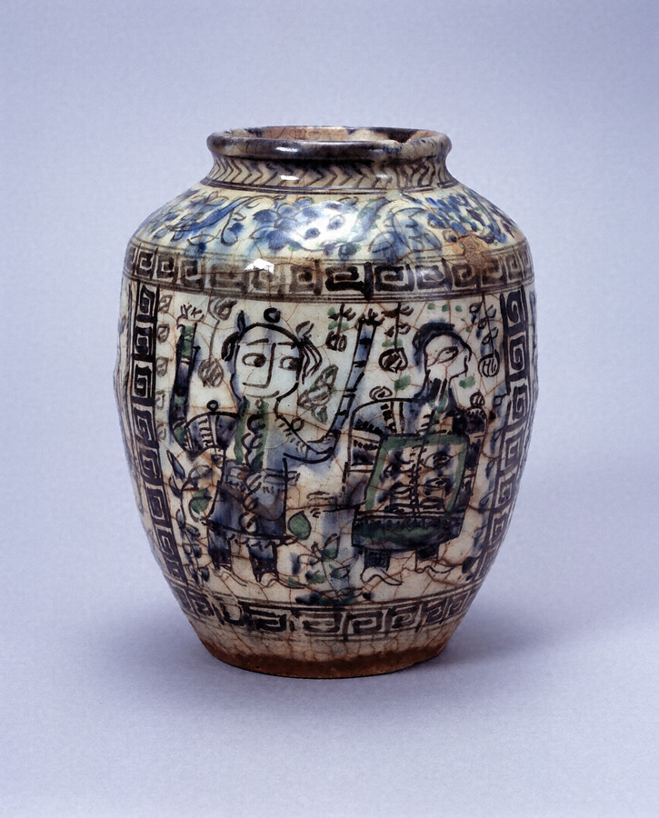 文様の特徴から、強精をほこったサファヴィー朝滅亡後、イラン南西部を支配したザンド朝(1750−1794年)期の所産と考えられる。日常雑器として使用されたのだろうか。