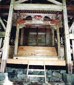 礫滝横の峻険な山肌を切り開いた6坪程の社地に建つ。ほぼ南面する鞘殿に収まる切妻造,板葺,平入の一間社で,背面と正面の前後に錣屋根を架け,正面左右柱上部や蟇股などに龍,獏,鳳凰などの彩色彫刻を施す。古くから地区住民により守られてきた神社。