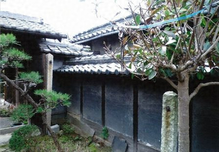 敷地の中央、主屋と離れの間に建つ。間口1.3mの腕木門で、切妻造桟瓦葺、折曲りに脇塀を延ばして奥まった雰囲気を醸す。門口に板扉を吊り、小壁に筬欄間を入れる。脇塀南面は、外塀と同様に竪板張と黒漆喰塗に白漆喰の帯を付し、良好な庭空間をつくる。