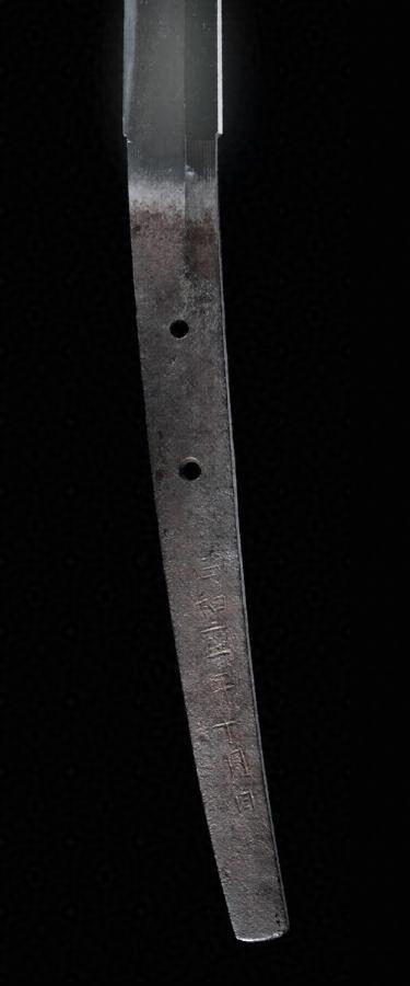 茎生ぶ、先栗尻、鑢目勝手下がり、目釘孔二。