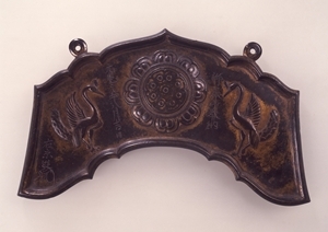 銅鋳製鍍金。上縁左右に各三弧を、下縁に五弧を連ねた蓮弧式山形磬である。縁は厚く、稜部を削いで断面は八角状をなす。両面の中央に八葉複弁の蓮華形撞座を高肉に鋳表し、表にはその左右に片足を挙げて立つ総体する孔雀を、裏には銘文を鋳出している。また、上縁左右の中弧頂部に蓮実形鈕を鋳出している。表の撞座の左右および左裾部に追刻銘がある。