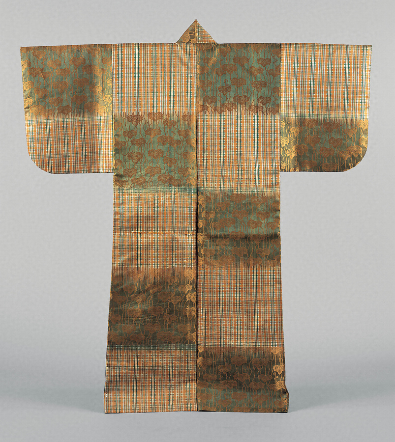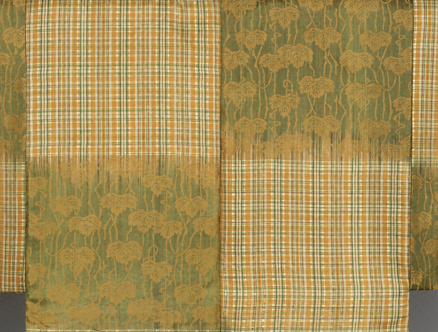 白地に薄茶・黄色・萌黄で織り出した小格子と、濃萌黄地に金茶で生い茂る蔦の枝・葉を織り表し、段替わりとした色無の厚板である。