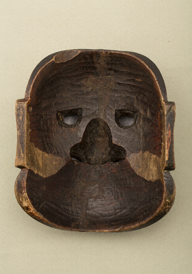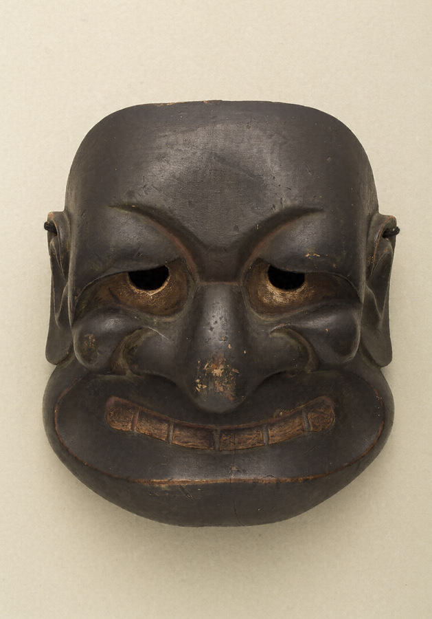 「武悪」は狂言に登場する鬼の面。一見恐ろしい鬼の相だが、舞台では喜怒哀楽、様々な感情がこの面から溢れ出てくる。鬼の面として用いられるだけではなく、相手を驚かすための小道具として使われることもある。武悪には様々な色があるが、この面のように全面を黒くしたものは珍しい。裏は、荒目だが美しい刀目を残して仕上げ、拭漆を施す。演者の顔への当たりを調整するため、後に裏の一部を削った跡や、木目に沿って欠けた跡があるが、その跡にも既に長い時間が感じられる。
