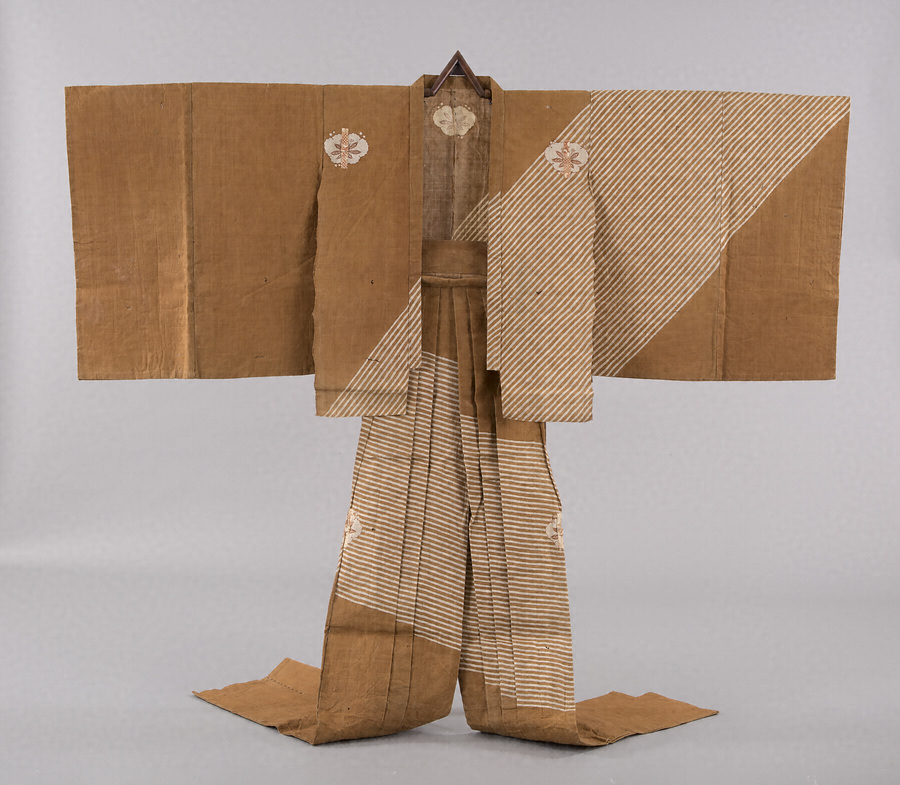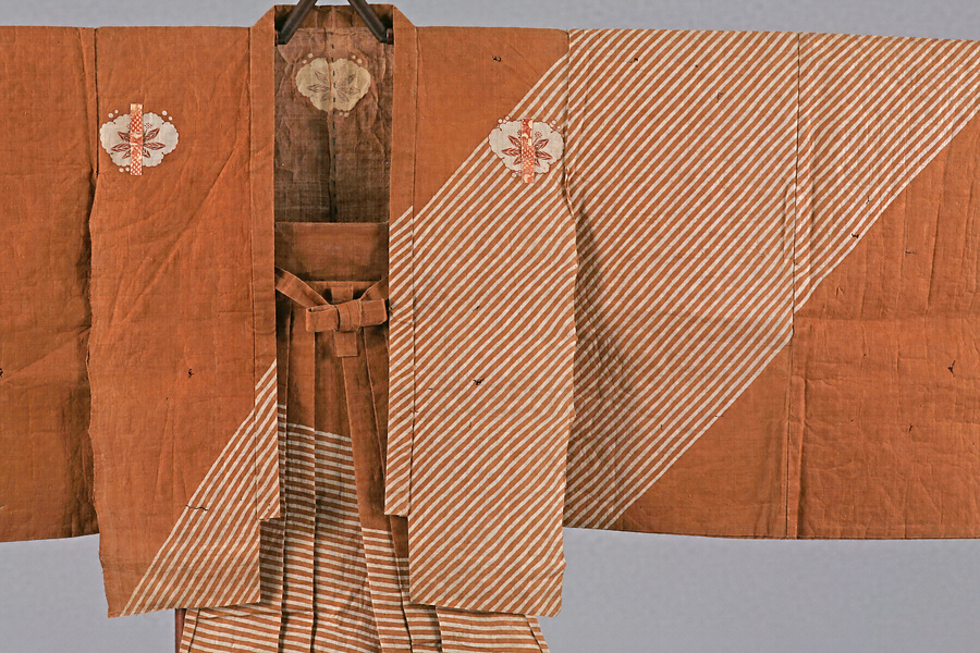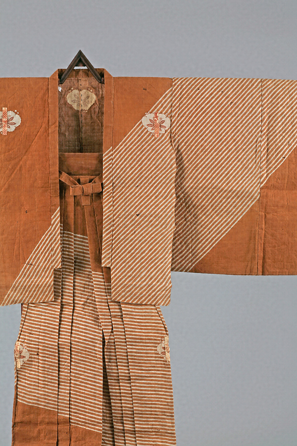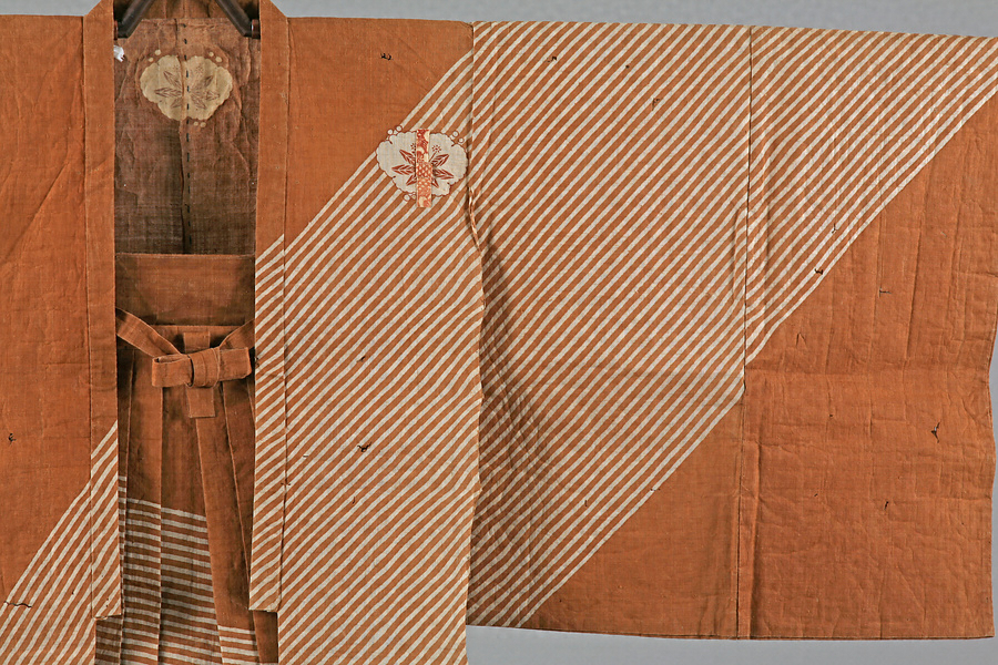 柿色に近い明るい茶地に細い斜縞が大胆に白く染め抜かれる。その斜め縞も上下で角度を変えた機知に富んだデザインとなっている。胸と背と袖、長袴の腰板と相引きに薺紋が据えられる。