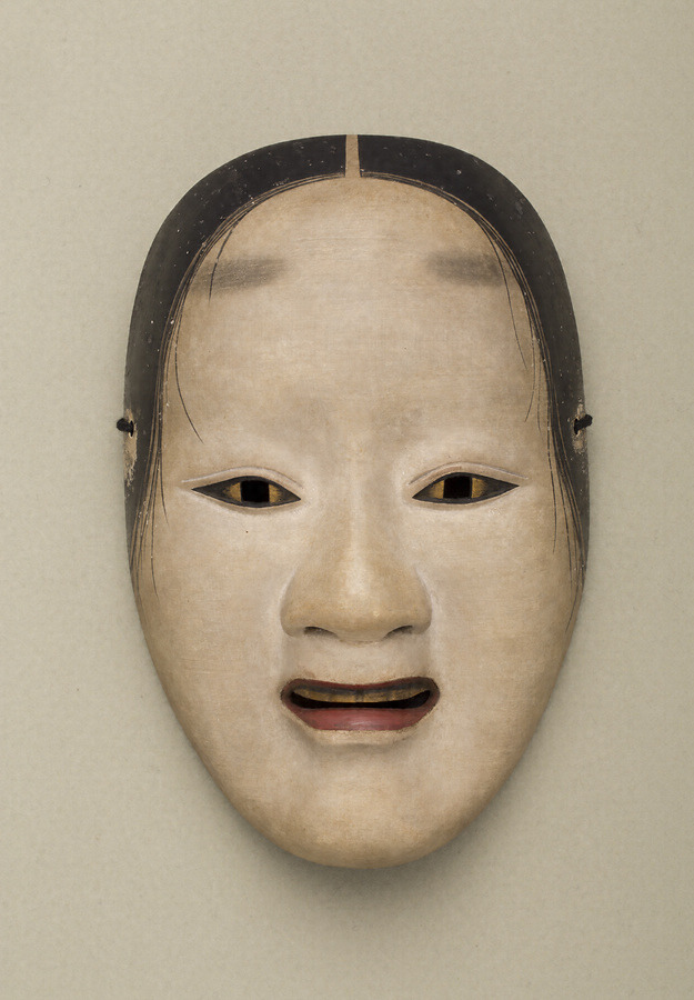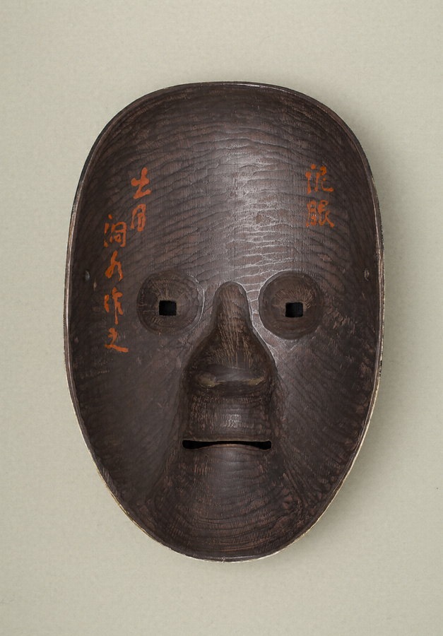 「泥眼」は目に金泥を施すところから名付けられた面。八世宝生大夫古将監重友(1619~1685は『面論記』に「海人の切に用面也」と記し、能〈海人(海士)〉の後シテのような成仏した女人や仏体の面という。一方で、金泥が涙のように光り、深い怨みを内に籠めた表情にもなることから能〈葵上〉などにも用いる。面裏には「泥眼 出目洞水作之」との朱漆書きがある。