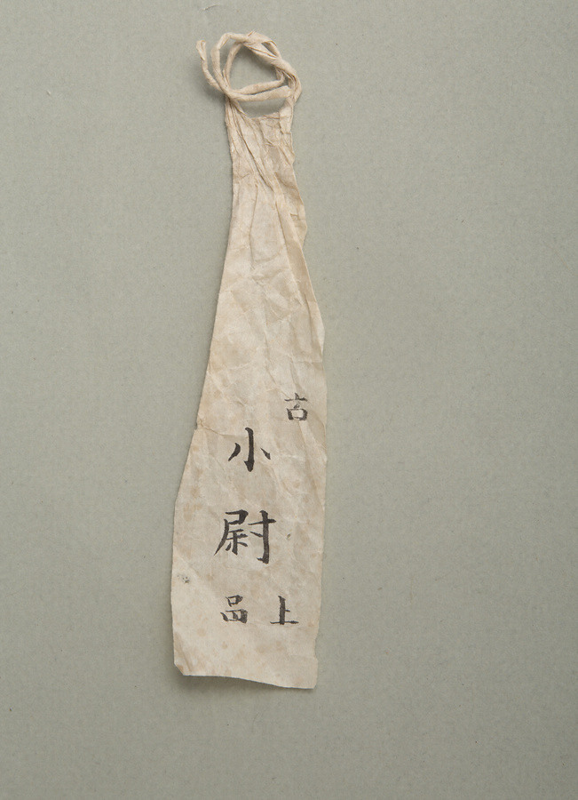 「古/小尉/上品」と墨書のある付札が附属する。「紅地麻葉繋花車模様縫箔」(国立能楽堂蔵)とともに伝わったとされ、土佐藩主山内家から明治維新後に高知城下屈指の豪商・川崎家へと伝来していた可能性がある。