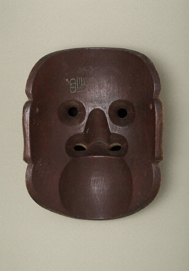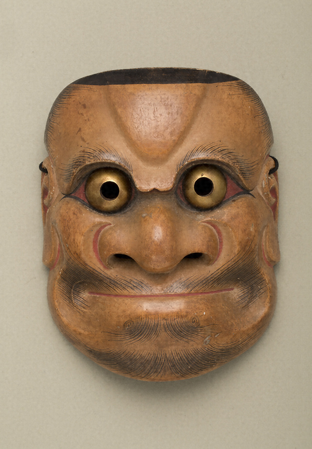 「長霊癋見」は怪盗・熊坂長範の専用面。面打の長霊が創作したための名とも云われる。長範は、三篠の吉次・吉六兄弟の荷を奪おうとし、牛若に討たれる。大癋見に近い造形だが、焦点のずれた特徴的な目に、大盗賊の悲壮感と滑稽味が表される。面裏には、緑青を差した「出目」の刻字がある。