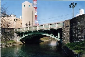 昭和3年からの富山市都市計画事業の一環で旧神通川廃川地活用のため開削された松川に架かる,橋長約16m・幅員約22mの鋼2ヒンジアーチ橋。道路線形に合うよう広幅員斜橋として架けられ,都市計画的にも近代性を備えている。