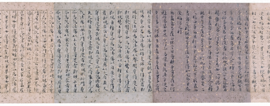本経は,平安時代院政期に書写された法華経一品経遺品で,平安貴族の嗜好を反映して美麗に意匠された装飾経である。表紙には白黄地紫飛雲に金銀切箔砂子を雲霞に散らしている。見返の経意絵は日輪の山の端より上がる図柄の大和絵で,観音菩薩の功徳を称えた経意を表したものであり,絵画資料としても著名なものである。料紙には白,紫,薄茶,藍打曇の色紙に金銀切箔を散らし,銀泥界を施している。