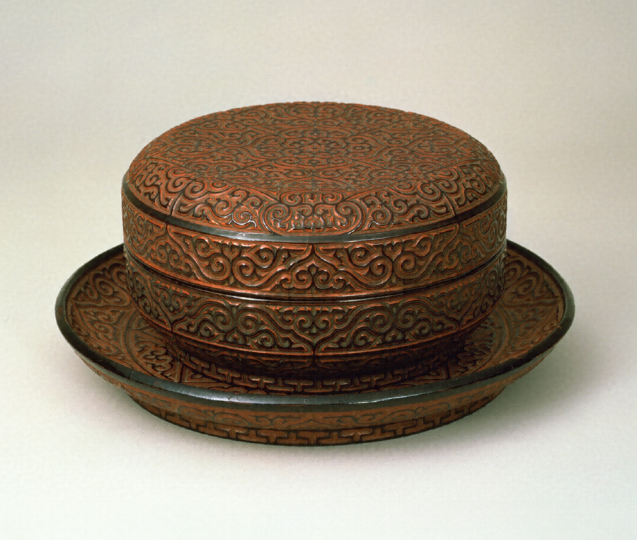 食籠は丸形の印籠蓋造で、唐草形の屈輪特有の美しい文様が彫られている。素地に黒漆と朱漆を塗り、黄・朱・黄・朱・黄・朱・黄・朱・黄・朱と繰り返し、最後に朱漆を塗っている。屈輪文による文様のリズミカルな構成は、見事な立体感を盛り上げ、刀痕も雄渾である。盆も同様の構成である。食籠と盆は本来、組物ではない。