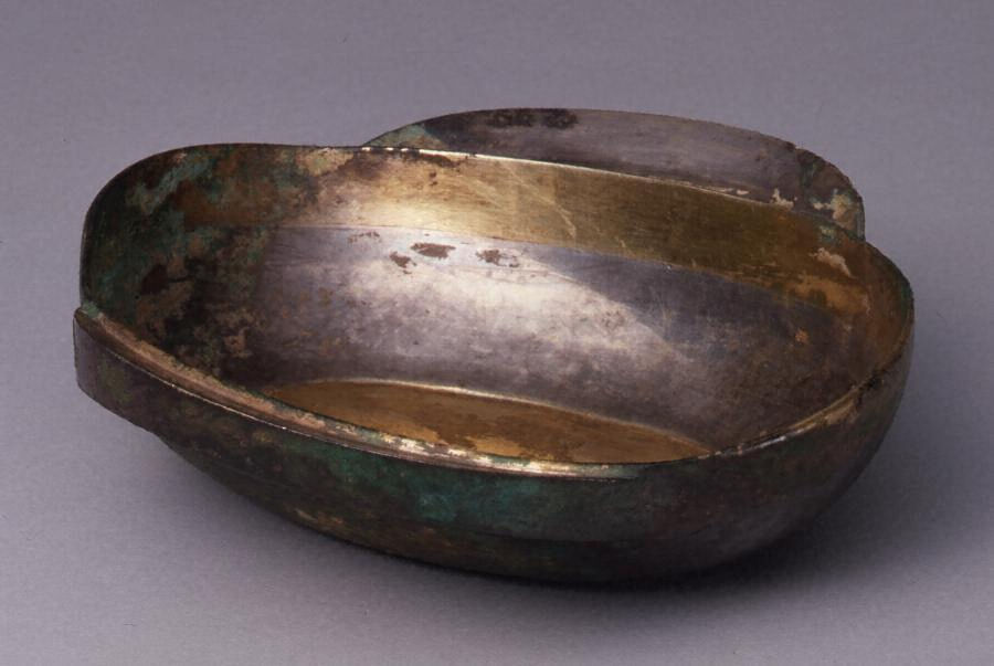 いわゆる耳杯である。現在器の周縁内外と内底に鍍金がよく遺っている。外底面に文字が三字鏤刻されている。