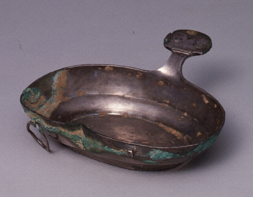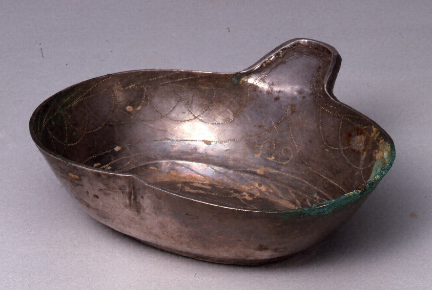 二と同様匏状の銀杯であるが、一方の指のかかりが柄状に大きく、他方の入り込みの両傍に游環が付されている。底面に三字 側面に十七字が鏤刻されている。