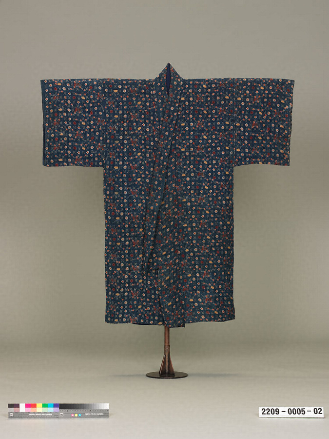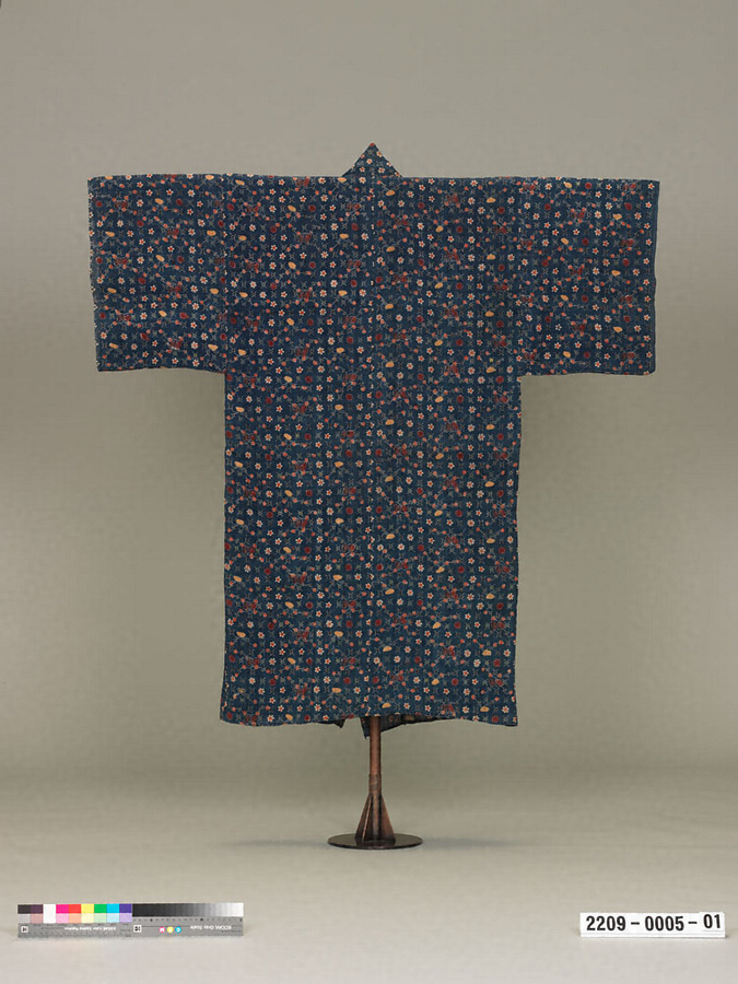 紅型は主に沖縄で制作されていた染め技法で、型染めの範疇に含まれる。小花や貝の細かい模様が施された細模様型の型紙を使用して染色した作品。衣裳 単衣。
