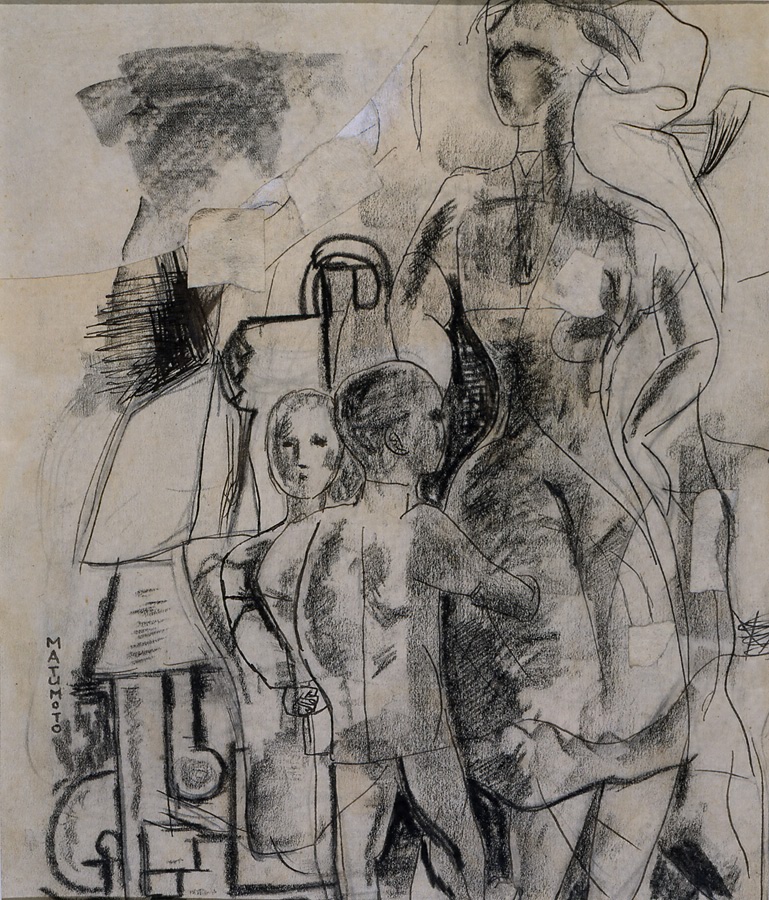 リアリズム(写実主義)という言葉はさまざまな意味で用いられるが、松本竣介の場合、まず線描表現のもつ抽象性として結実している。美術学校で教わる初歩的な技術でも、単に対象に似せて描いた曖昧な気分でもない、視覚や感性をこえた根源的なリアリズムをこの画家は求めた。昭和十年後半に、竣介は油彩による家族像の大作「画家の像」を制作したが、ここに紹介する素描は同じ家族を対象にしながらも、油彩より自由な線描表現となっている。思想的な文脈でリアリズムというのであれば、太平洋戦争のただ中でも、なおたくましく生きる群像を描いた「画家の像」の方がリアルだが、昭和初期の前衛芸術に影響を受けながら、自然な芸術家の魂の発露としてのリアリズムを追求した画家松本竣介にとって、こうした伸びやかな線による作品こそ、より竣介らしいと言えるのかもしれない。(荒屋鋪透)