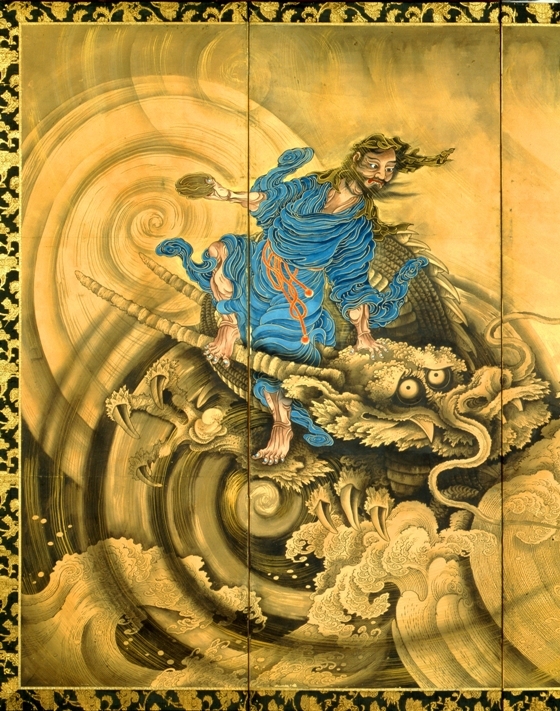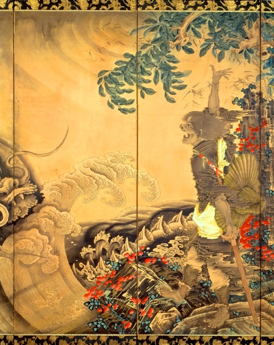 両隻にわたって描かれた仙人たちは、右隻の鉄拐仙人、左隻の蝦蟇【がま】仙人のように識別できるものもあるが、大半は特定の仙人に同定しがたい。