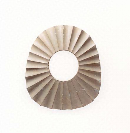 軟質で淡緑色を呈した緑色凝灰岩と思われる石を隅丸台形に加工し、その中央に円孔を穿ったものである。表面には放射状に26本の稜線を施し、この形の模倣のもととなった貝の放射肋と溝を表現している。裏面は若干内反りとなっているが、何の文様も施されていない。鍬形石や石釧とともに、この時期流行した腕輪形宝器の一つ。
