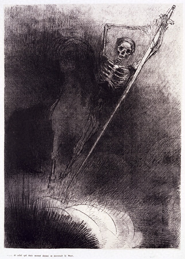 小羊が第一から第四までの封印を解いた時、それぞれ侵略、戦争、飢饉、殺戮を象徴する4人の者が馬に乗って出現した。デューラーはこの劇的場面を、疾駆する馬で人々を揉欄する「4人の騎士」の現実感溢れる姿で表現したが、一万ルドンは4名の中、「青白い馬」に乗り黄泉(よみ)を従える「死」だけを採り上げた。死を骸骨の姿で暗示する方法は、中世以来の慣習であると共に、19世紀後半の象徴主義的画家たちの作品群に再三再四見られるものである。ルドンの描く死神は、16世紀ネーデルランドの画家ブリューゲルの作品「死の勝利」のモティーフを想起させるが、ただしルドンはこの骸骨が示す運動表現を、デューラーの「黙示録」第12場面の「大天使ミカエルと龍の戦い」から借用したと思われる。すなわち「死」は両手で長い槍形の剣を握り締め、両腕を頭上高く持ち上げて、地上で光る肉塊を、斜め上方から突き差す瞬間を示している。これはデューラーの描いた大天使ミカエルが、同様の姿勢で足元の龍の喉元を槍で突き差す描写に酷似する。画面右上万から左下万に走る対角線的形態配置は、ルドンが特に好んだものであり、これはこの石版画集においても、〔6〕、〔7〕、〔8〕、〔10〕の諸場面で繰り返し用いられた。また画面中央の青白い馬は、腹部と前脚のみを背後の暗闇から浮かび上がらせ、その頭部は暗黒の世界に埋没している。柔かくて細かい無数の線描を重ねて、あるいは濃くあるいは薄く描かれた闇の表現は、「死」が従える黄泉(よみ)を象徴している。見逃せないのは、死神の印象に一抹の寂しさが感じとれることである。しかもここでは殺戮される人物描写が省略されているために、死神の行動には加虐性や血腥さはほとんど感じられず、静かな象徴図となっている。(中谷伸生)