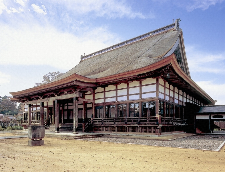 現在の本堂は、寛文五年(一六六五)の地震による倒壊後、延宝七年頃に再建された。間口が二十八メートルに及ぶ大規模な建物で、内陣や内外陣境は彫刻、金箔、漆で装飾されるなど、本山、別院に並ぶ格式高いあつかいになっている。