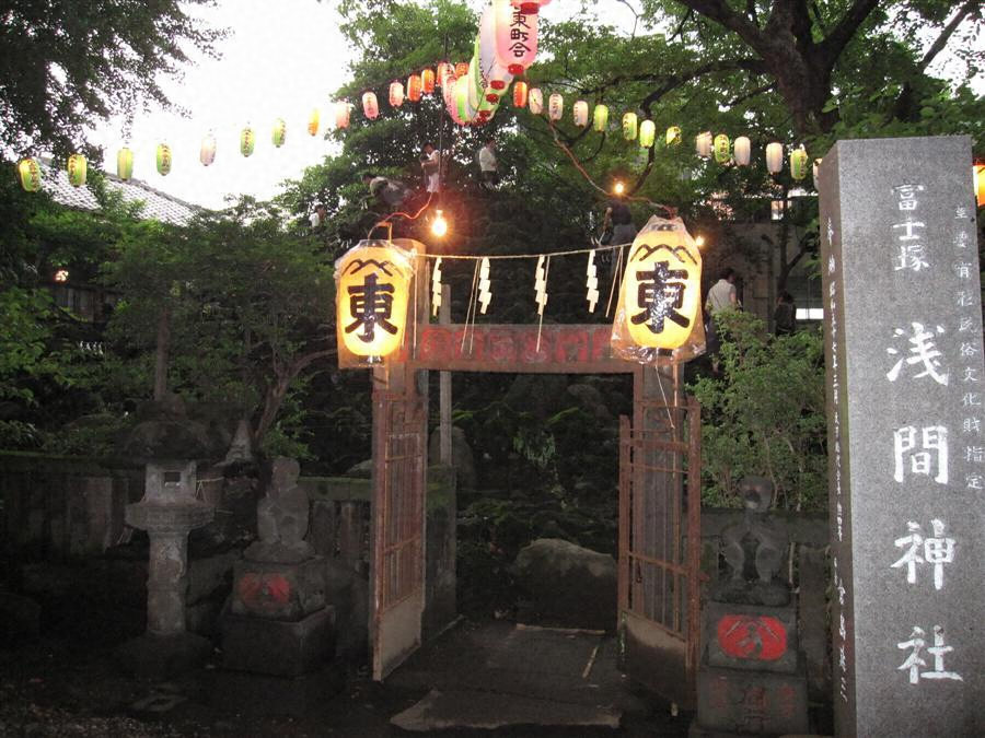 下谷坂本の富士塚は、富士講の一派入谷東(山東)講によって文政11年(1828)、小野照崎神社の境内に築造されたもので、高さ約5㍍、直径約16㍍、塚全体を富士の熔岩でおおっている。塚の上の登山道に合目石を建て、一合目の岩屋に役行者像、五合目付近に富士講の祖と崇められる藤原角行(1646年没)の像をまつる石祠を置く。
