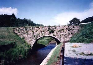 井堰から約3km下流に位置する石造単アーチ橋。橋長34mで,天端のほぼ西寄りの位置に幅1.6mの水路を通す。迫石を二重とし,スパンドレルではほぼ扇状に石を積み,その上部で布積とさせる。周辺の田園景観に馴染み,市民に広く親しまれている。