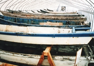 ムダマハギとは、船底に刳り抜き材を2枚使用し、平らな船底にタナイタをつけ、アバラと呼ぶ補強材をつけた独特の構造の船である。