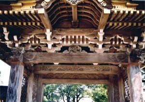 入母屋造,銅板葺の四脚門で,左右に築地塀形式の板壁をL字型に設ける。四隅の角柱は腰長押より下部を外拡がりとし,出組と蟇股をあげ,二軒繁垂木で前後に軒唐破風をつけた軒を受ける。全体に精緻な技巧を駆使した豪放な門で,寺院の正面景観を整えている。