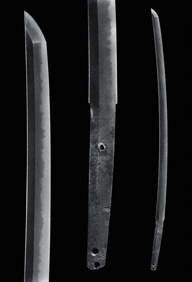 鎬造、庵棟、磨り上げながら腰反り踏張りあり、鋒猪首。鍛小板目肌よく約み乱映り立つ。刃文丁子、蛙子交じり、匂口冴えて締まり、足、葉よく入る。帽子乱れ込み、表尖り、裏掃きかけ心に尖る。茎磨り上げ、先栗尻、鑢目筋違、目釘孔三、二字銘。