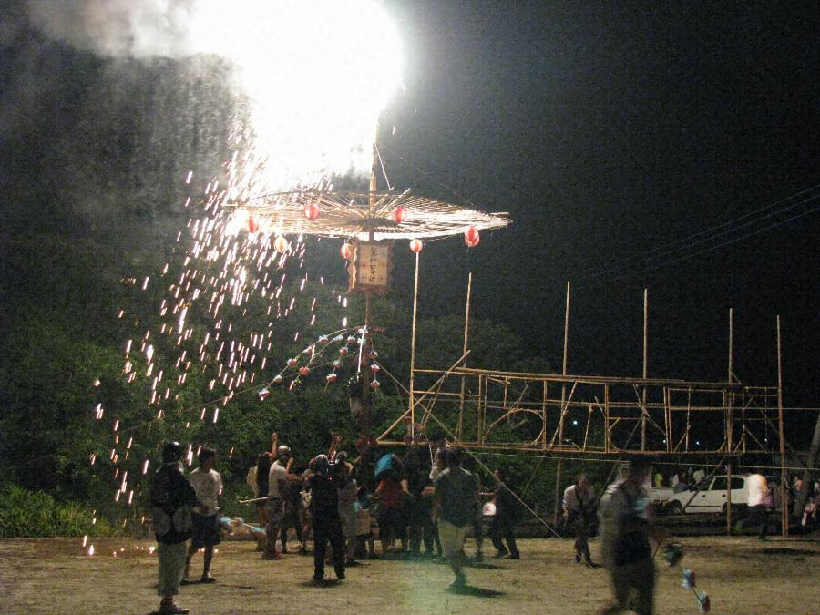 この行事は、旧新治村大畑の鷲神社の境内で行われている行事である。神社での雨乞いの祝詞等に続いて、境内に立てられたからかさの形の大万灯に仕掛けられた花火が、100㍍遠方の鳥居のところから導火線を伝って操作された火によって点火され、夜空に火のからかさ形を描き出すものである。(※解説は選択当時のものをもとにしています)