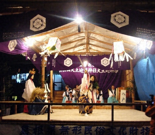 島根県内各地の神楽は、中世後期に当時の修験者などが中心になって工夫し始まったとされる。その後、中世末期から近世初期にかけて、同県鹿島町の佐太神社で、当時の能を取り入れた神楽が始まった。これは、まず仮面を付けない七座と呼ばれる儀式的な舞があり、次に仮面を付けた能の翁と三番叟が演じられ、その後、同様に仮面を付けて神話などを題材にした演劇的な舞が続くというものである。以後、島根県内各地の神楽は、宗教者によって、この構成に準じて演じられるようになっていった。