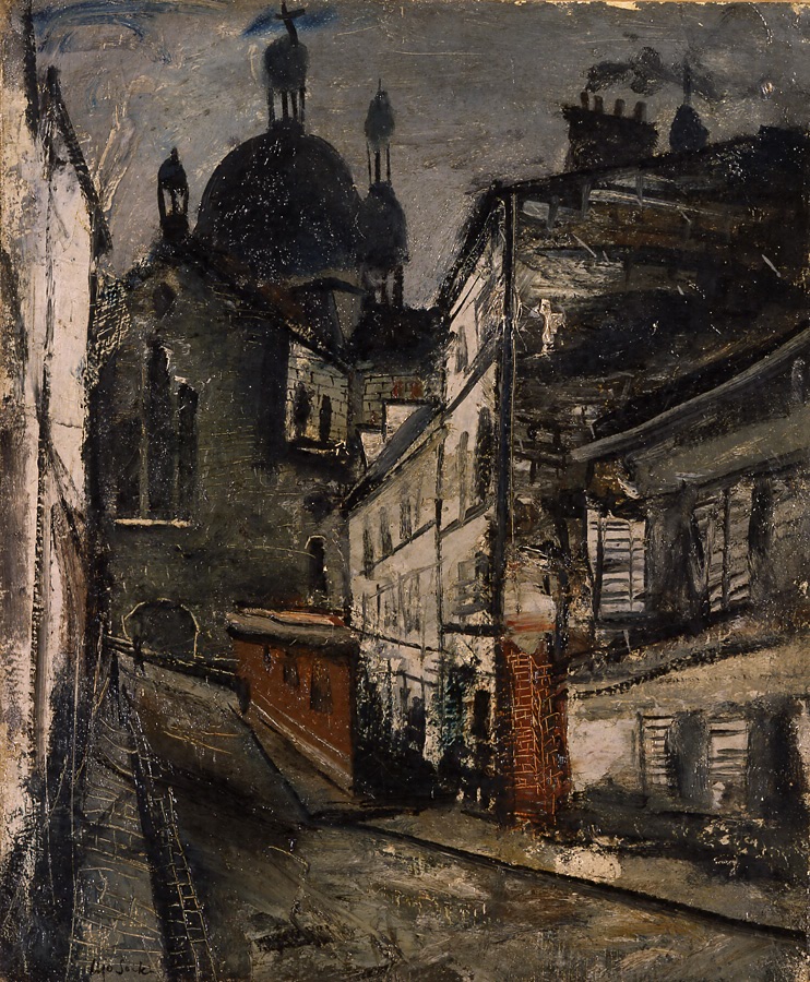 曲がりくねった道の左右に、白い壁の建物が立ち並ぶ。画面の奥にそびえるのは大きなドームを冠する教会。寒空には雲が垂れ込め、建物の煙突からは煙がたなびいている。統一感のある色調のなかで目を引くのは、わずかに用いられたレンガ色。絵画表面には絵具を勢いよく削りとったあとや、投げつけられた絵具の塊等、作者の格闘の痕跡も残る。憂愁を帯びた街路には、人影も見える。